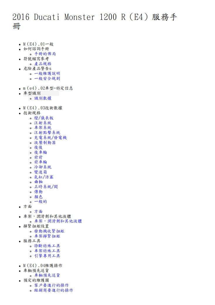 2016杜卡迪怪獸Monster1200 R維修參考資料(含英文原文與繁體譯文,含扭矩)