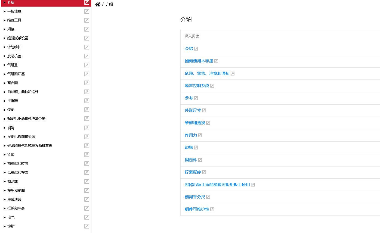 内容范围:引擎、传动、电路系统、线路图、故障代码、扭矩值、保养程序等